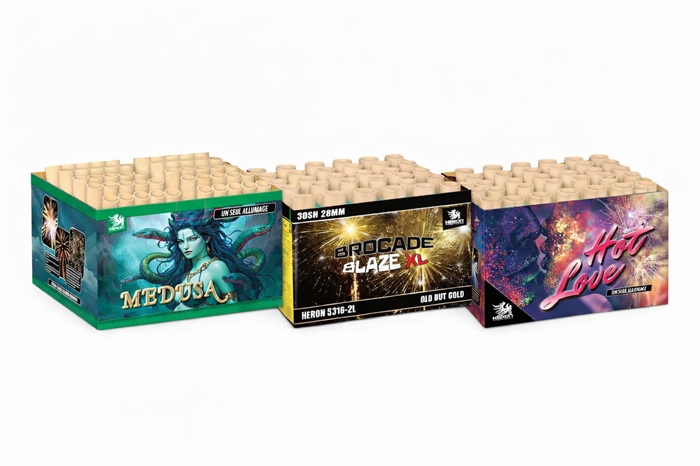 Denne kombi pakke til 995,- samler tre stærke batterier fra Heron i ét skarpt pakketilbud. Du får både brede guldpalmer, romantiske farver og en markant finale – perfekt til mindre og mellemstore nytårsshows.