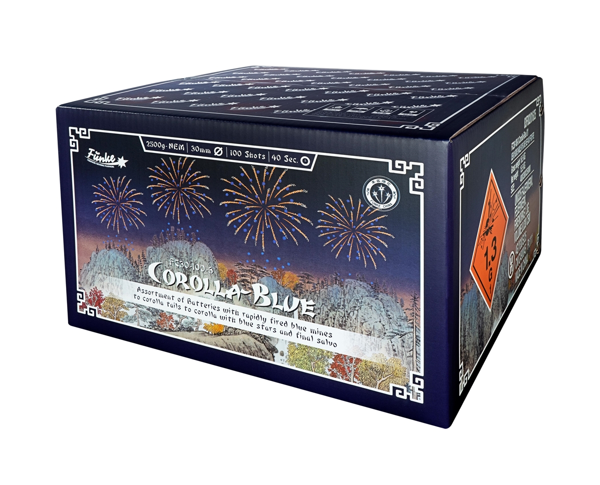 COROLLA BLUE er et eksklusivt sortiment med 4 batterier à 25 skud i 30 mm. Showet kombinerer blå feuer­töpfe, corolla-opstigninger og blå buketter indrammet i brede guldweiding-effekter.