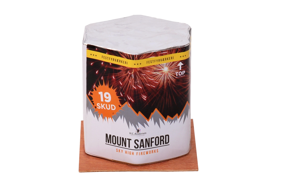 Køb FYRVÆRKERI - Mount Sanford - 19 skud - NYTÅRSBATTERI! Forbløffende godt batteri som opskyder 19 skud med kulørte og klartlysende bomber der eksploderer med crackling regn. Perfekt til festlige lejligheder.