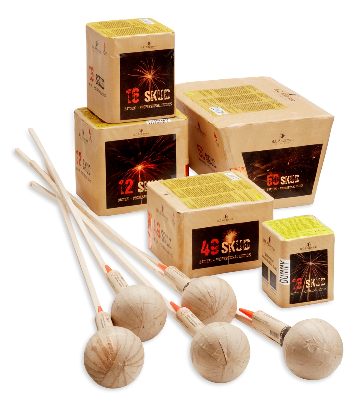 Sortiment indeholder: 1 stk. HCA310 49 skuds batteri, 1 stk. HCA311 16 skuds batteri, 2 stk. HCA312 12 skuds batteri, 1 stk. HCA313 16 skuds batteri, 1 stk. HCA306 50 skuds Vifte batteri, 5 stk. HCA111 4" luftbomber