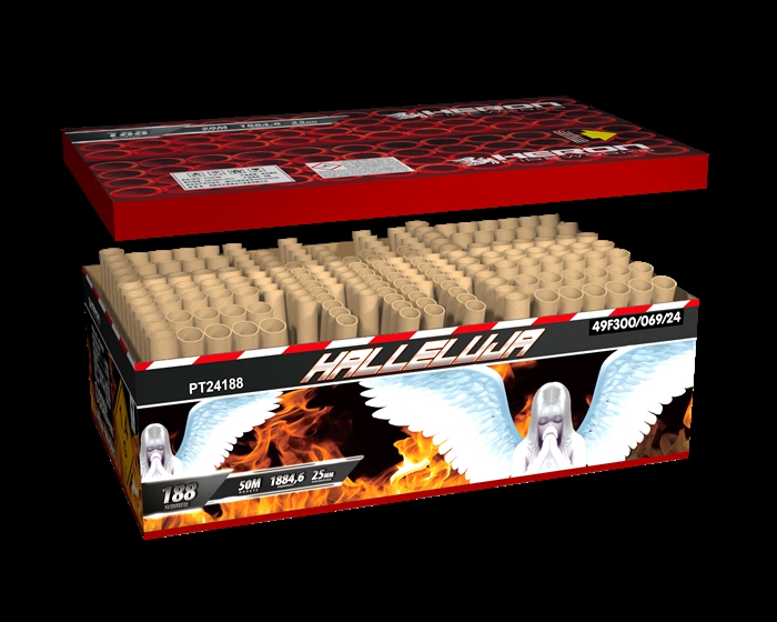 HALLELUJA er opbygget som en kraftig F2-compound med i alt 188 skud fordelt på rør i 20–25 mm kaliber. De mange rør og den høje krudtmængde giver tunge løft, store buketter og et show, der visuelt ligger tæt på professionel pyroteknik. Den fysiske størrelse på ca. 670 × 365 × 206 mm gør den til et markant hovednummer på enhver affyringsplads.