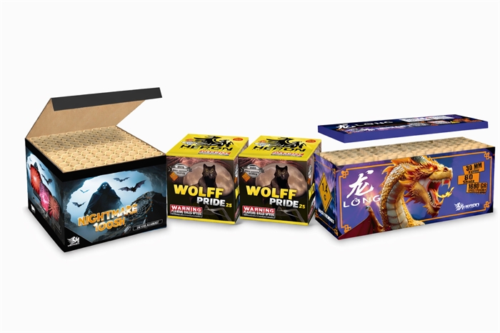 Du får Wolff Pride 25 (2 x 375 g NEM) som stabil opener, LONG (1.880 g NEM) som hovedshow og Nightmare (820g NEM) som ekstra kraftig finale. I alt ca. 3.450 g NEM pakket ind i fire tunge batterier.