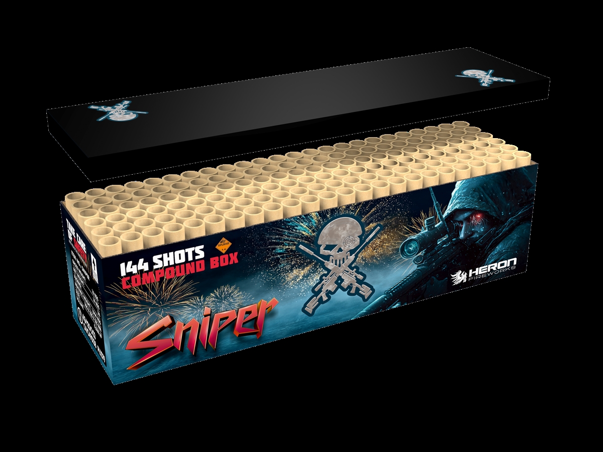 SNIPER er en imponerende I-formet compound cake med hele 144 skud i 25 mm. Den er opbygget i flere sektioner med skiftende tempo, så showet hele tiden udvikler sig – fra rolige skud til tætte serier og kraftige salver. Det giver en oplevelse, der minder om et professionelt sammensat display.