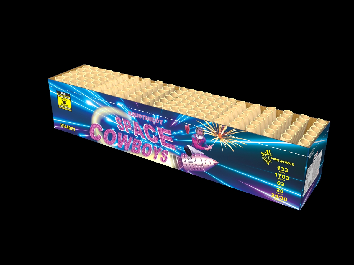 SPACE COWBOYS er et episk showbatteri med 133 kraftige skud i både 25 og 30 mm. På ca. 80 sekunder leverer det et spektakulært show med store buketter, farveeksplosioner og hængende guldhaler, som føles som fyrværkeri fra det ydre rum.