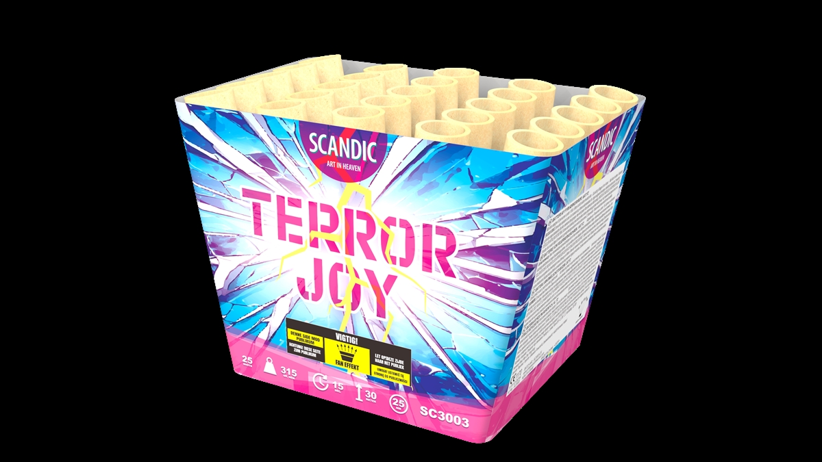 TERROR JOY er et kompakt og aggressivt showbatteri med 25 kraftige skud, der leverer et eksplosivt forløb på blot 15 sekunder. Store farveburst og brede buketter gør showet voldsomt og intenst fra første affyring.
