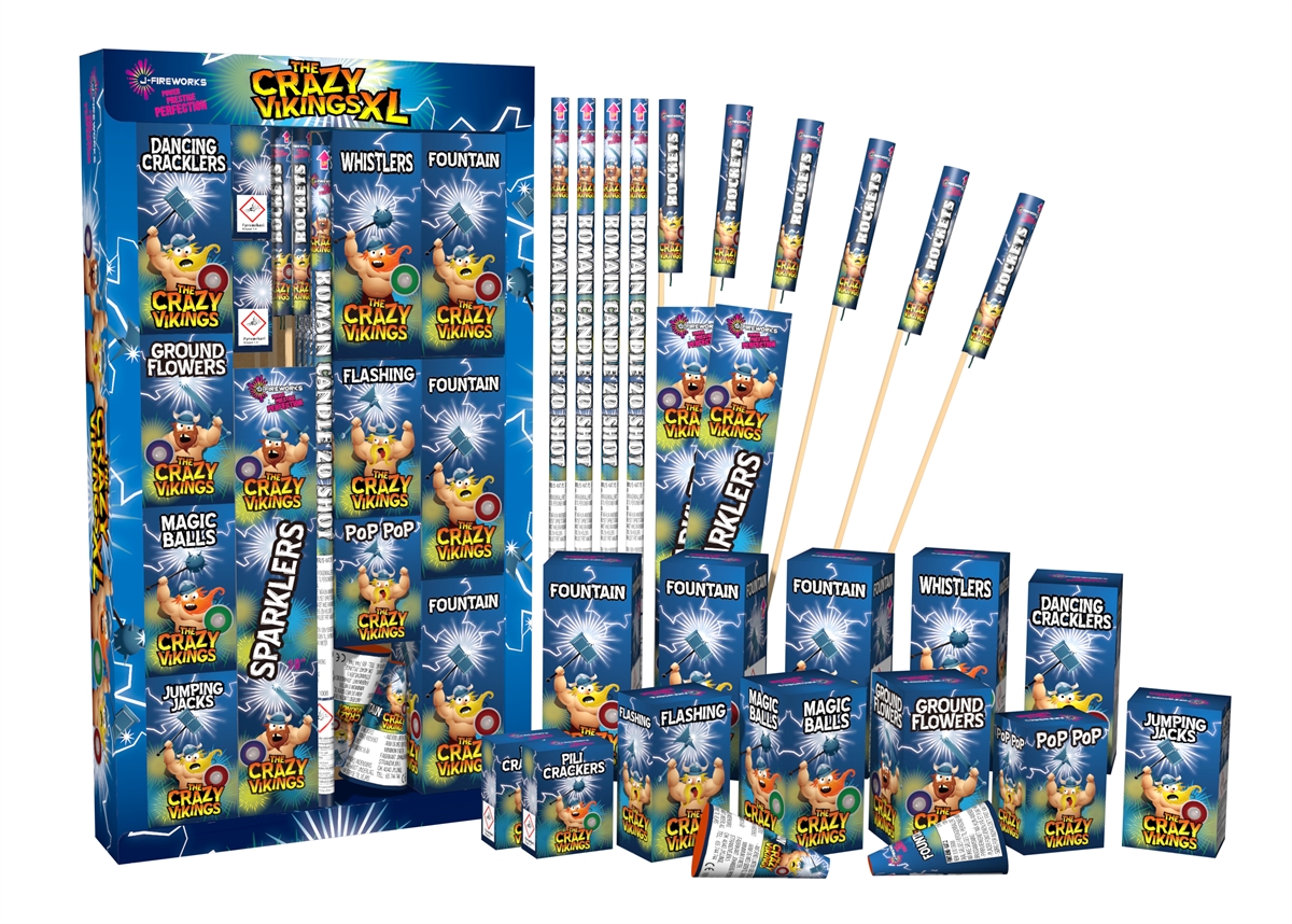 CRAZY VIKINGS XL er et stort, sjovt og varieret sortiment med 337 enheder, der giver underholdning hele aftenen. Med 265 g NEM og et bredt udvalg af effekter er det den perfekte familiepakke fyldt med lys, lyd, bevægelse og farver.