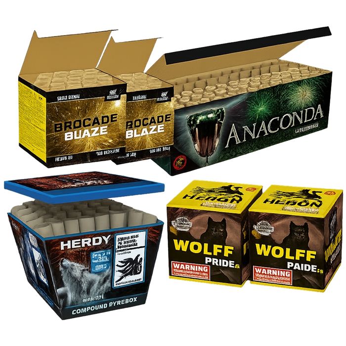 Pakken består af Wolff Pride 25 - 2 stk. (750 g NEM), Grey Wolff (490 g NEM), Brocade Blaze (2 stk – 262 g NEM) og Anaconda (672 g NEM). Samlet får du ca. 2.174g NEM fordelt på seks meget populære batterier.